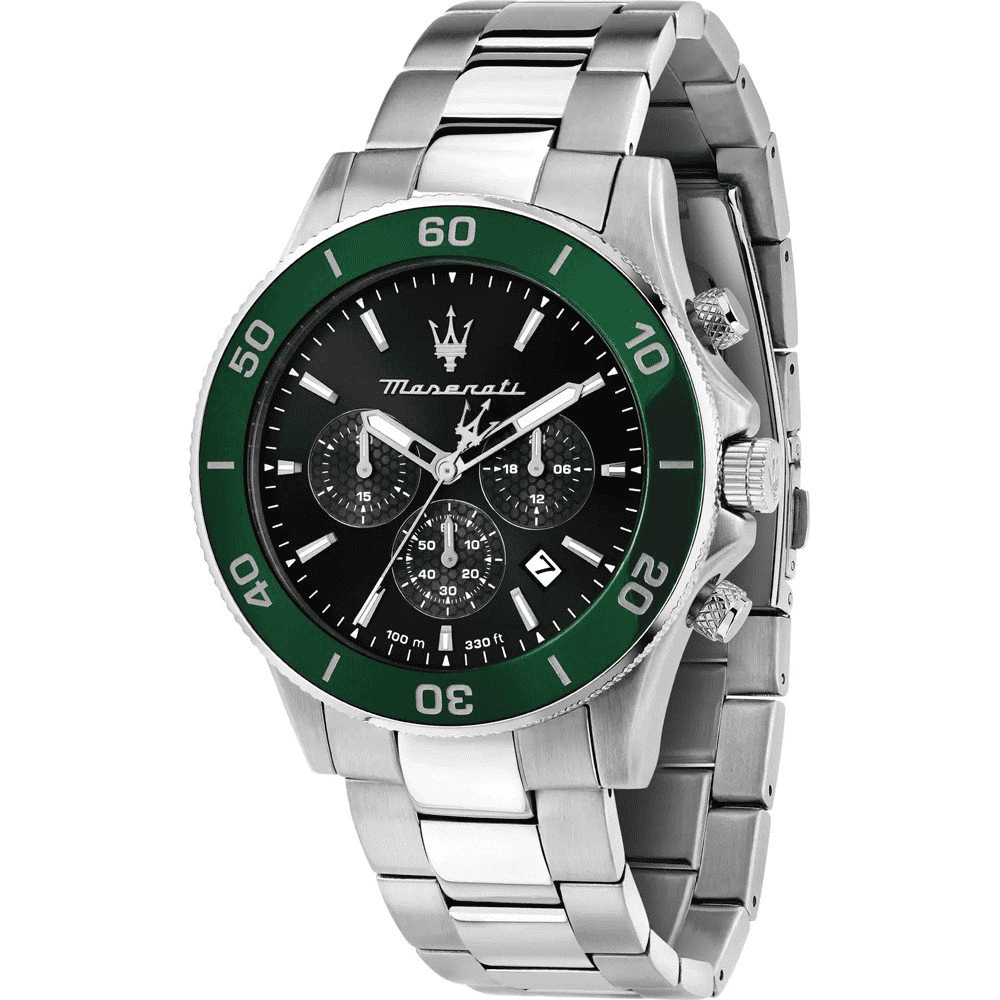 Maserati R8853151017 Attrazione férfi karóra – 43 mm-es ezüst színű rozsdamentes acél tok, smaragdzöld számlap dátumfunkcióval és három segédszámlappal. Precíz kvarc szerkezet, strapabíró ásványi üveg, acél karkötő deployment zárral. Vízállóság 5 ATM. Elegáns és sokoldalú, alkalmas mind hétköznapi, mind formális öltözékhez.