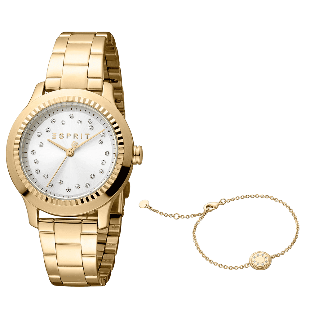 Az Esprit Joyce Golden Tone fehér számlapos női karóra kvarc szerkezettel és analóg kijelzővel rendelkezik. A 34 mm-es rozsdamentes acél tok arany tónusú kivitelben készült, és rozsdamentes acél szíjjal van ellátva. A fehér számlapot ásványi kristályüveg védi. A karóra 5 ATM-ig vízálló, és tartalmaz egy HMS funkciót (óra, perc, másodperc).