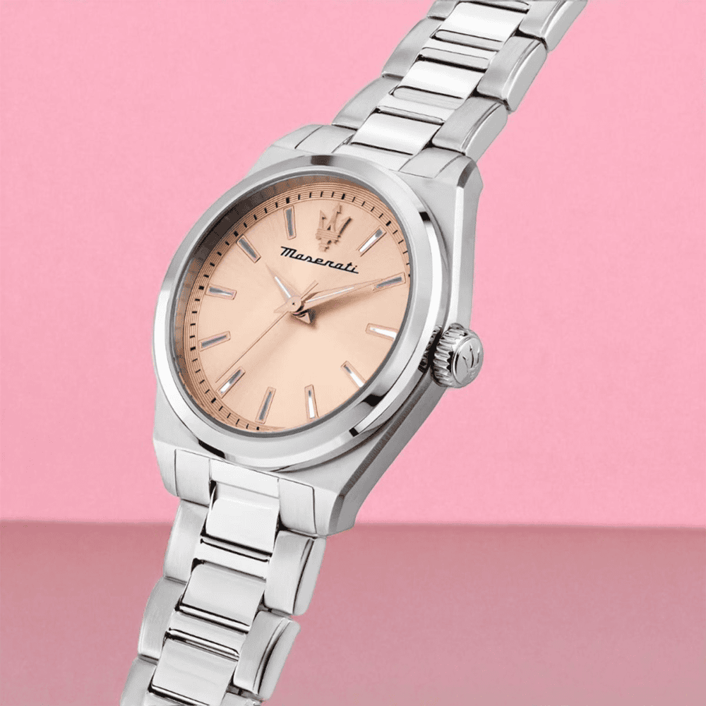Maserati Velocita’ R8853152505 női karóra ezüst színben, barackrózsaszín számlappal.
