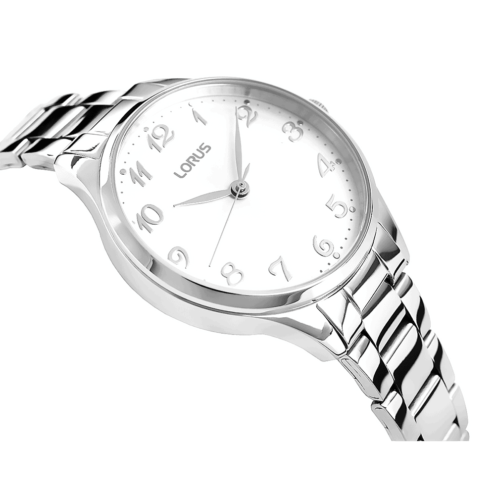 Lorus RG267VX9 női karóra, pontos kvarc szerkezettel. 32 mm-es rozsdamentes acél tok ezüstös kivitelben, ezüst számlap arab számokkal és jól látható indexekkel. Lapos, ellenálló ásványi üveg. Acél szíj gombos nyitással. 50 m (5 ATM) vízállóság, alkalmas mindennapi használatra és rövid úszásra. Elegáns és praktikus kiegészítő a modern nő számára.