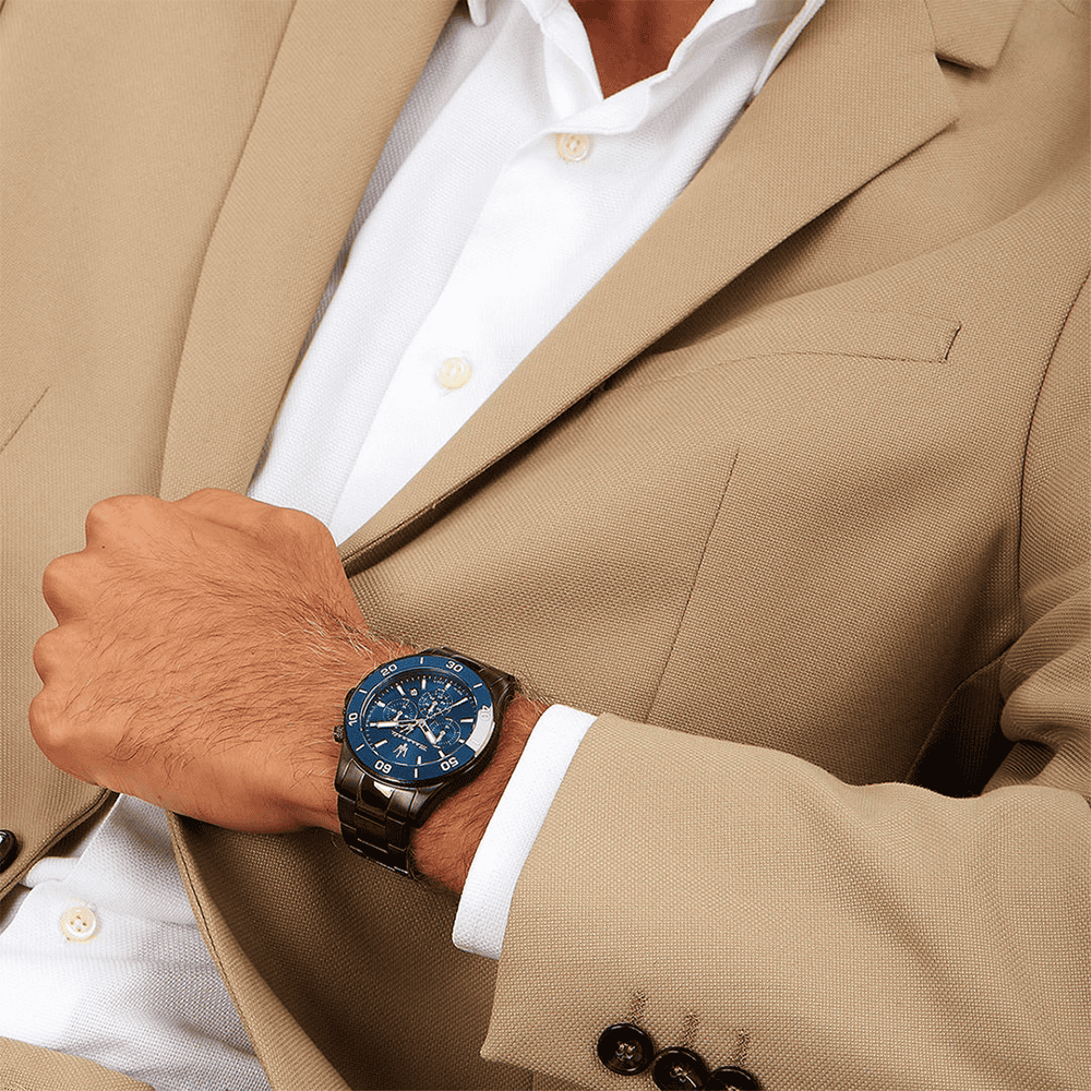 A Maserati férfi karóra, R8873600005 referencia, a COMPETIZIONE kollekcióból, ötvözi a sportos eleganciát a technikai precizitással, a dizájn és a teljesítmény iránti szenvedély szimbóluma. A kerek tok, amely rozsdamentes acélból készült, 43 mm átmérőjű, és egy élénk kék számlapot foglal magában, amelyet napsugár effektus díszít, lenyűgöző fényjátékot teremtve. Ezt egy tartós Sapphire kristály védi, amely biztosítja a tisztaságot és a hosszú távú védelmet a karcolások ellen. Az óra nagy pontosságú kvarc mechanizmussal működik, és kronográf funkcióval van ellátva, amely pontosságot és további funkcionalitást kínál. A rozsdamentes acél karkötő búvár csattal van felszerelve, amely kényelmet, biztonságot és kifinomult sportos megjelenést biztosít.