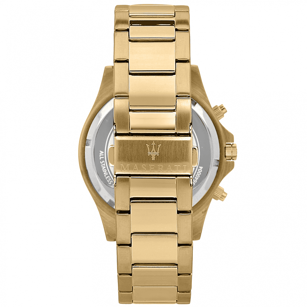 Férfi Maserati óra, SFIDA kollekció, ref. R8873640008, rozsdamentes acélból készült, sárga arany pvd, kvarc mozgás, kronográf. Az óra rozsdamentes acél szíjjal van felszerelve, biztonsági zárral ellátott csattal. A kerek tok 44 mm-es, és napkék számlappal, ásványi kristállyal gazdagított. Vízállóság 10 ATM-ig. Az óra a hivatalos Maserati bemutatódobozában található, 2 év garanciával. Maserati Sfida kollekció: egyedi vonalak és stilisztikai részletek jellemzik az ebben a kollekcióban található órákat, robusztus kialakítással, amely nagy acéltokot (44mm) mutat forgó lünettával vagy tachiméteres lünettával, és oldalán knurling befejezéssel.