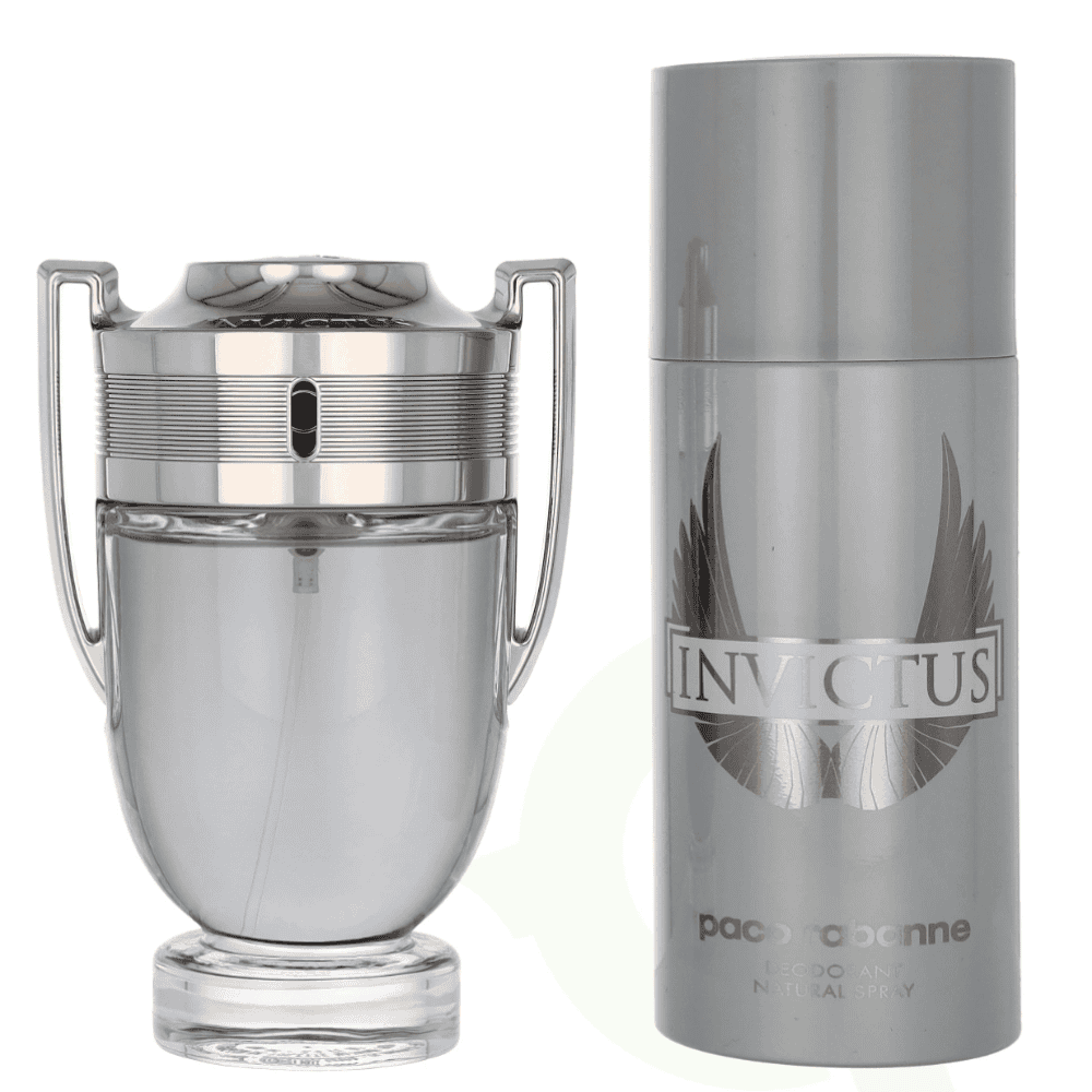 Paco Rabanne Invictus ajándékszett – tartalmaz egy 100 ml-es Eau de Toilette-t és egy 150 ml-es dezodort. Egy energikus férfiillat, amelyet friss grapefruit és tengeri jegyek jellemeznek, kiegészítve babérlevéllel, jázminnal és meleg, fás alapjegyekkel. Ideális az aktív és magabiztos férfi számára.